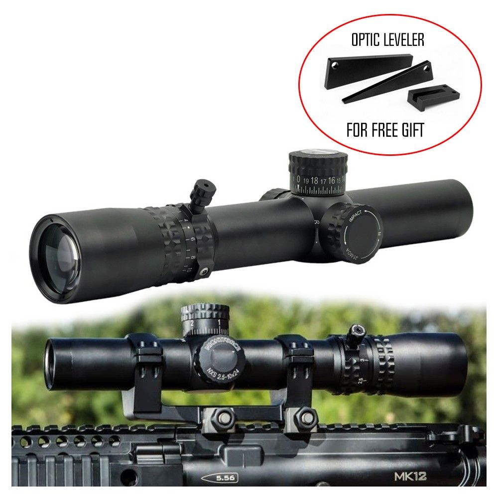 NXS 2.5–10 MOAR with ED glass and illuminated reticle. Ideal for SPR rifles, ARs, hunting, and airsoft. Free OPTIC LEVELER included.